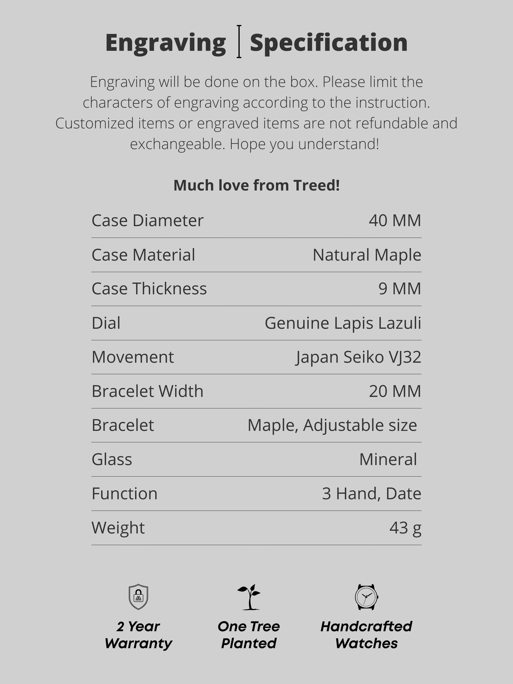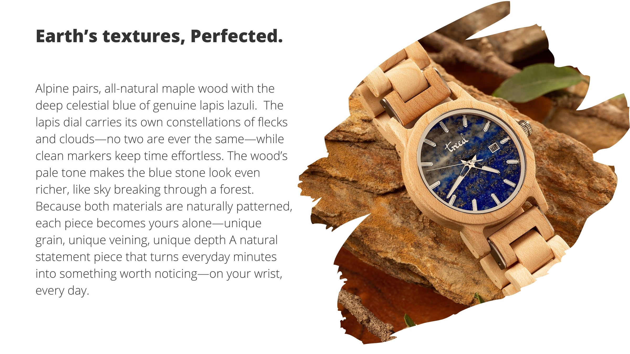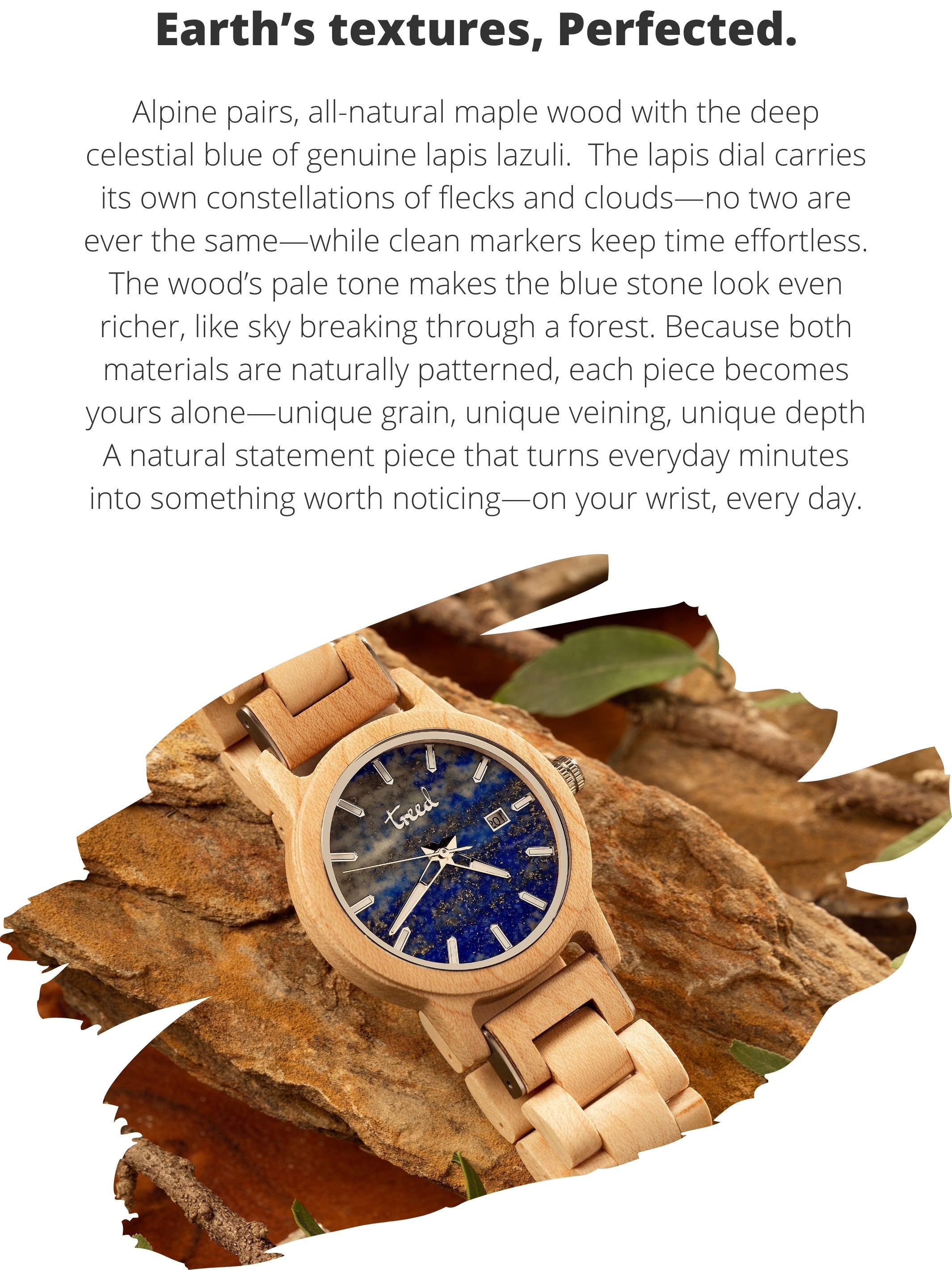 Treed Alpine (Maple/Lapis Lazuli) wooden watch with genuine lapis lazuli dial